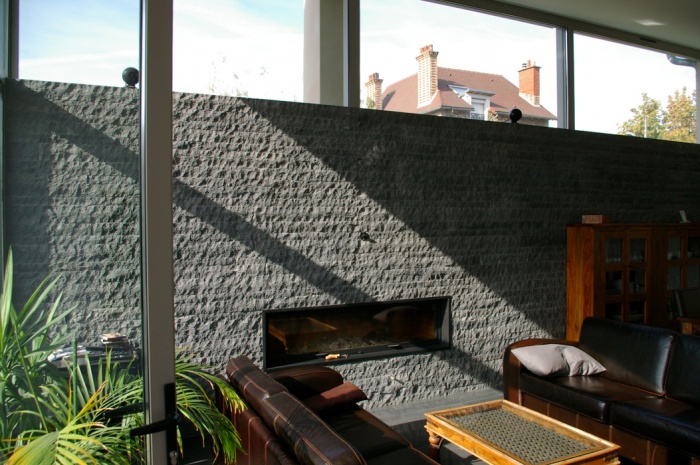 Le projet consiste en l'énonciation physique d'un processus climatique et de sa contextualisation in situ. Des nappes écrans, minérales, quasi monolythiques, viennent inscrire le projet dans un territoire cuvette marqué par la présence de l'eau de par la submersibilité du site et la proximité quasi immédiate d'une nappe phréatique. Ces nappes écrans suggèrent le système de chauffage géothermique mis en place qui capte les calories dans le sous sol aqueux pour y produire une résonance thermique en surface dans l'inertie même de ces supports géologiques. Ces écrans minéraux verticaux et géométraux nous installent dans un glissement basaltique renvoyant à celui produit par un magma émergeant refroidi par la nappe phréatique. Un mapping de basalte disposé dans un intérieur constamment installé dans l'exterieur renvoyant à l’identité de ses occupants, originaires des plaines situées autour de l’Etna, en Sicile, dont chacun des fragments minéraux, taillés et sculptés proviennent; des pierres chaudes pour un confort des corps en contact direct, une minéralité refaçonnant les instances d’un lieu et de ses usagers.