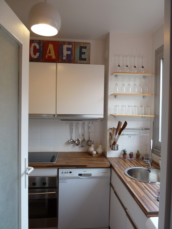 Pour répondre à ces attentes, j'ai supprimé tout le mobilier et les équipements de l'appartement ainsi que le sol du salon et de l'entrée qui étaient recouverts de lino aspect parquet. Par contre, les revêtement du sol de la cuisine et de salle de bain ont été conservés car ce sont de beaux matériaux (faïence et tomette).